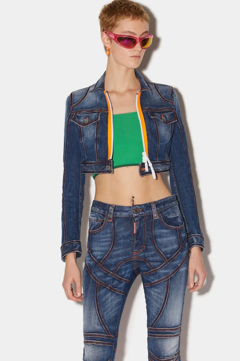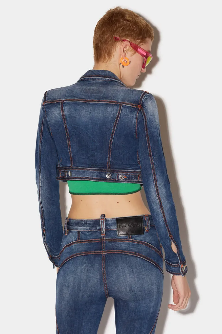 Stand Out From The Crowd In This Dsquared2 Denim Jacket. The Slim-Fit, Long-Sleeved Cropped Design Is Eye-Catching, With Its Dark Fade Wash And Prominent Stitching Details All Over. The Visually Striking Zip Closure On The Front Adds An Edgy Twist To This Classic Jacket. Pair With Some Distressed Jeans And Boots For A Rebellious Look, Or Dress It Up With A Skirt And Heels.